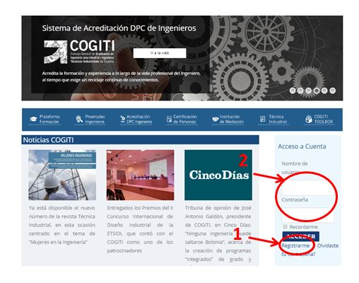 Los interesados en acceder a este servicio deberán REGISTRARSE COMO USUARIO en el COGITI y una vez validados por el Colegio tendrán acceso a las normas UNE, introduciendo su usuario y contraseña en la zona habilitada y accediendo la opción del menú superior izquierda, denominada "ZONA PRIVADA" y seleccionando "NORMAS UNE". (Ver imágenes con pasos a seguir para acceder a las normas).